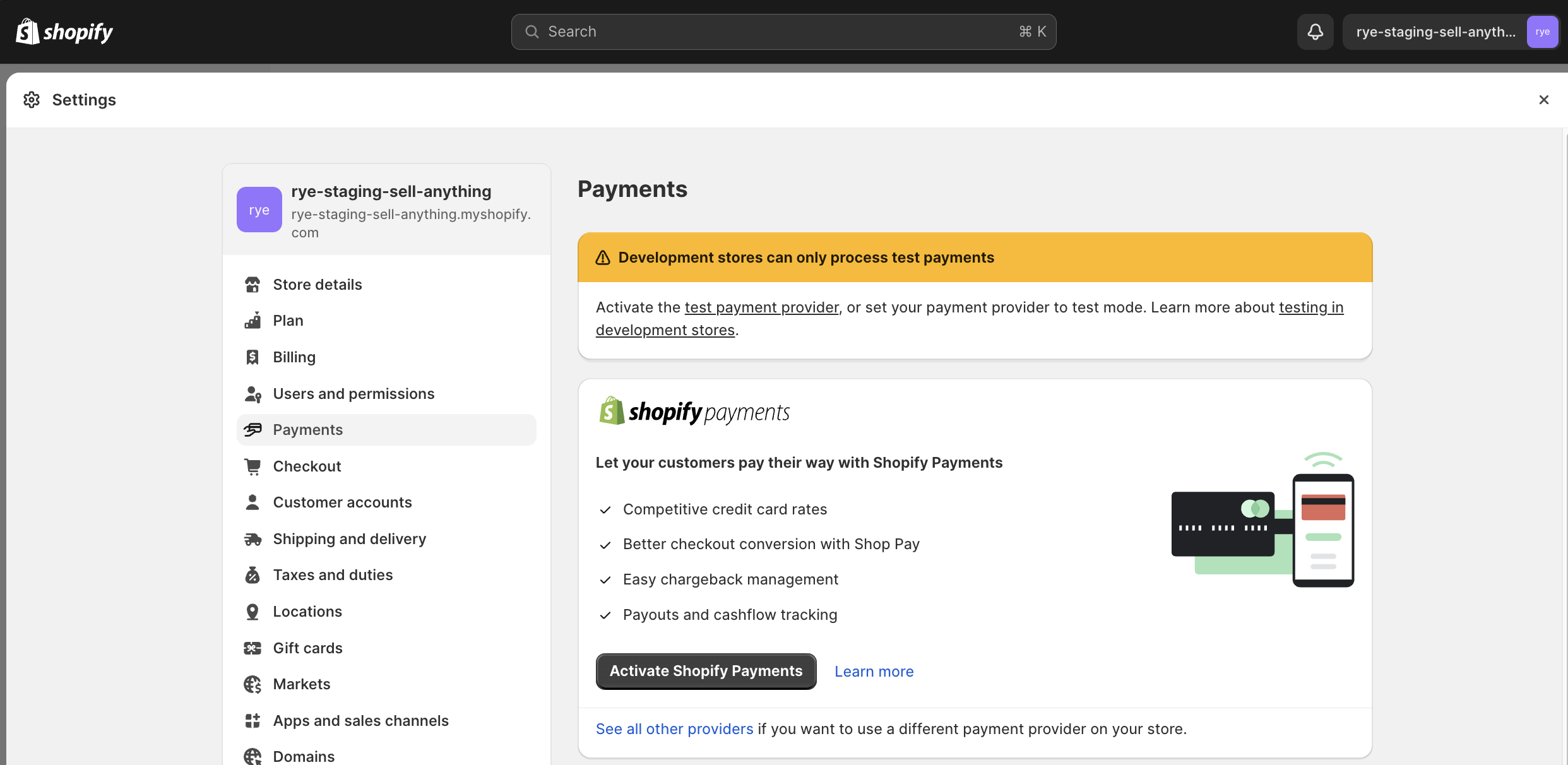Enable Test Mode for Shopify Payments