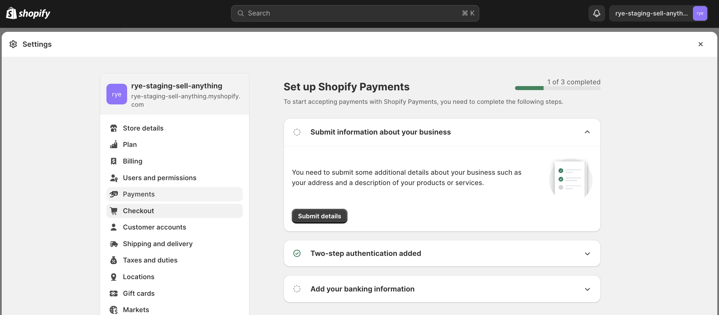 - Fill in the required information in order to enable Shopify Payments.